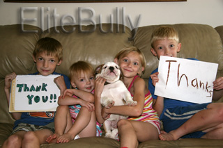 My wife and I recently purchased our second English Bulldog from Dmitri. Our experience was so positive in terms of quality of pet, shipment management and after delivery follow-up that we have sent Elitebully two referrals with in the first month of receiving the dog. Throughout the entire process Dmitri communicated with us in an honest and professional manner. Even when our dog arrived in California at 1 AM Dmitri insisted we contact him via telephone to confirm its safe arrival. Incidentally, we called him at 4 AM Texas time. We would recommend, and have recommended, this breeder to anyone looking for an elite quality bulldog at a very fair price. We though you would like to have a picture of our sweet little boy Porky, that we are extremely happy with. Thank you again Dmitri!